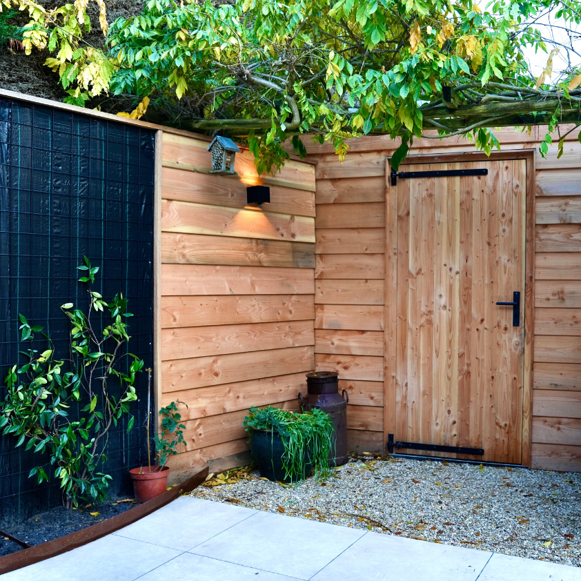 En alsof dat nog niet genoeg was, hebben we ook een schuur mogen aanbouwen, in een bijna onmogelijke hoek. Dankzij maatwerk past deze perfect in de beschikbare ruimte.